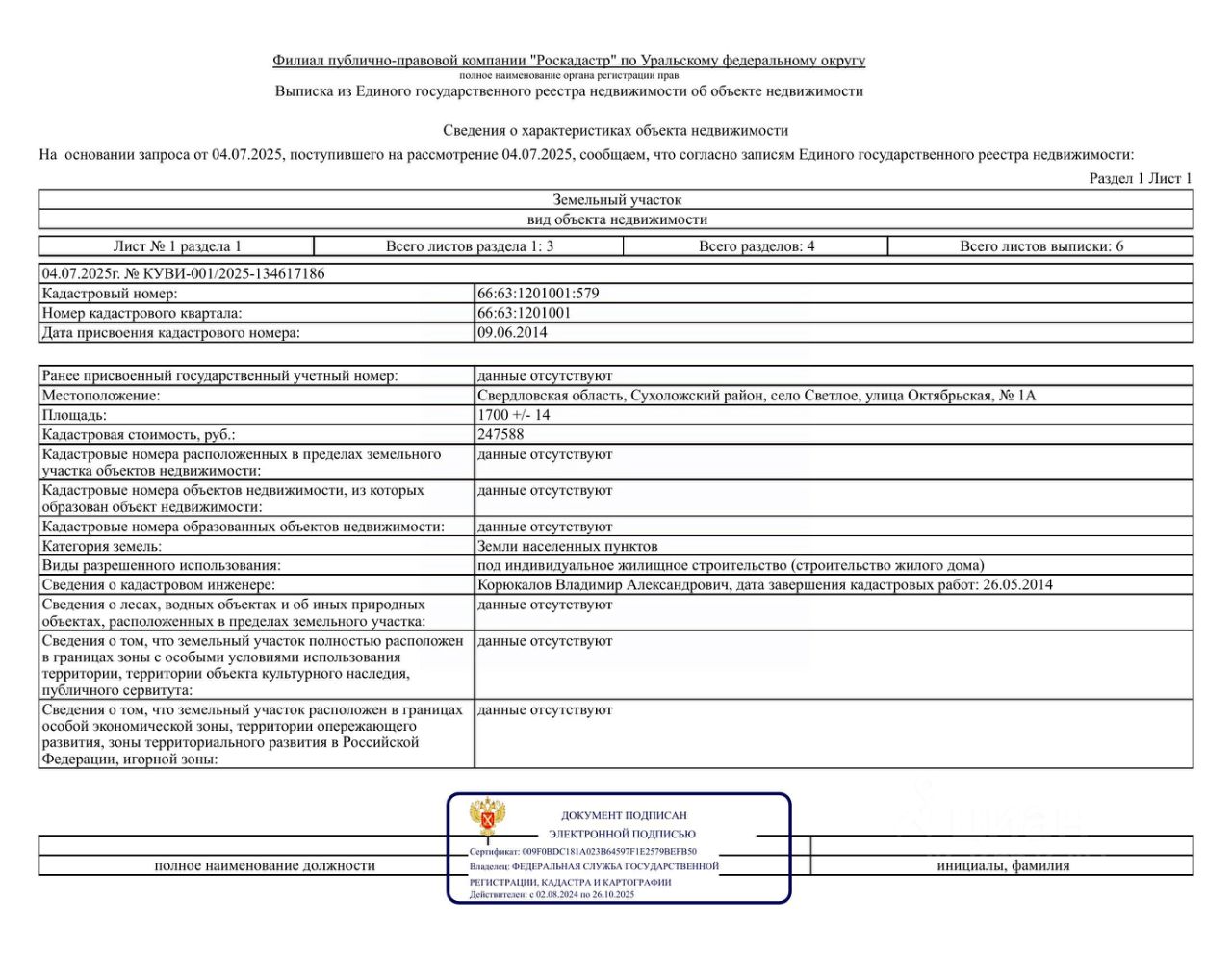 Продажа земельного участка с кадастровым номером 66:63:1201001:579, расположенного по адресу: Свердловская область, Сухоложский район, село Светлое, улица Октябрьская, 1А, общей площадью 1700,0 кв.м. (категория земель земли населенных пунктов), с разрешенным использованием под индивидуальное жилищное строительство (строительство жилого дома), территориальная зона Ж3 ЗОНА ЗАСТРОЙКИ ИНДИВИДУАЛЬНЫМИ ЖИЛЫМИ ДОМАМИ В СЕЛЬСКИХ НАСЕЛЕННЫХ ПУНКТАХ (далее Участок) в границах, указанных в выписке из Единого государственного реестра недвижимости об объекте недвижимости