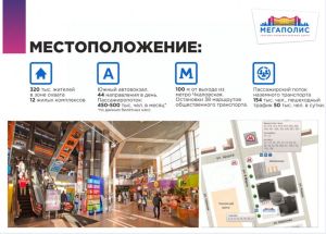 ТРЦ Мегаполис - класса А, расположен на пересечение ул. Щорса — 8 Марта, рядом автовокзал, остановки, где ходят 38 маршрутов общественного транспорта и всего в 100 м. от станции метро. 250 магазинов, кафе на любой вкус и многозальный кинотеатр. Близость метро и Южного автовокзала обеспечивают хороший трафик.
