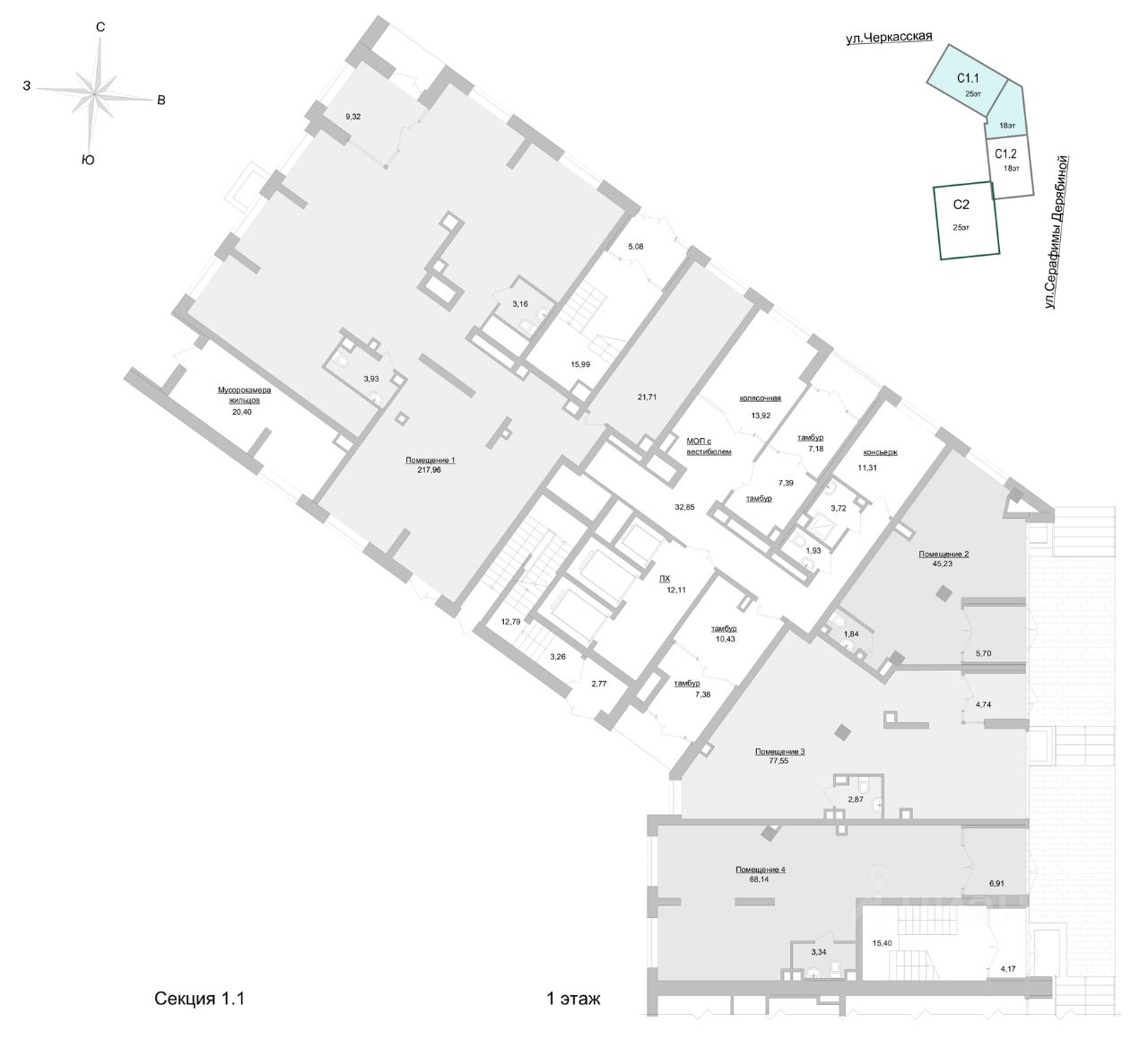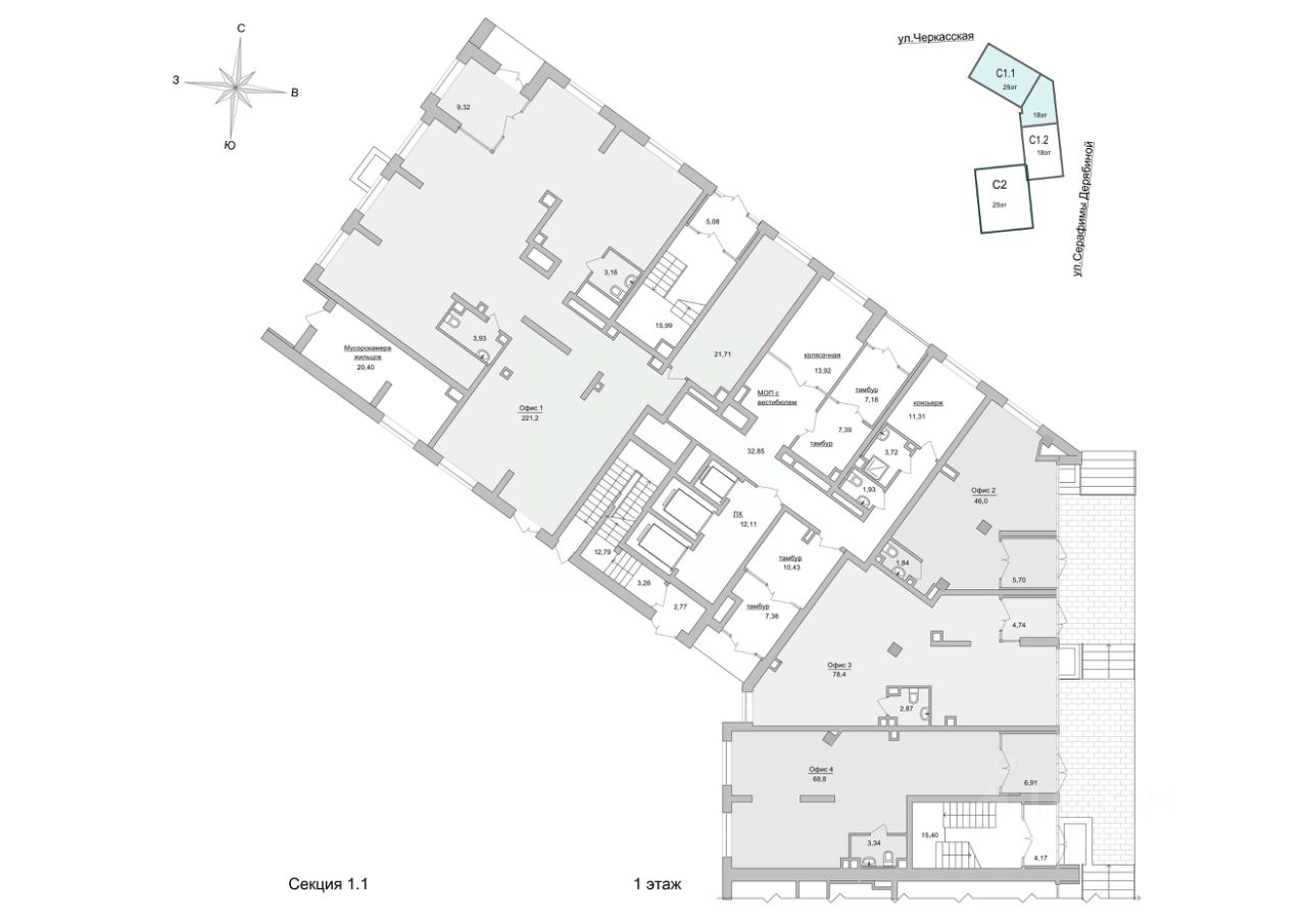 Коммерческие и офисные площади размещаются в секции 1.1 и на 3-х этажах делового центра (секция 1.3).