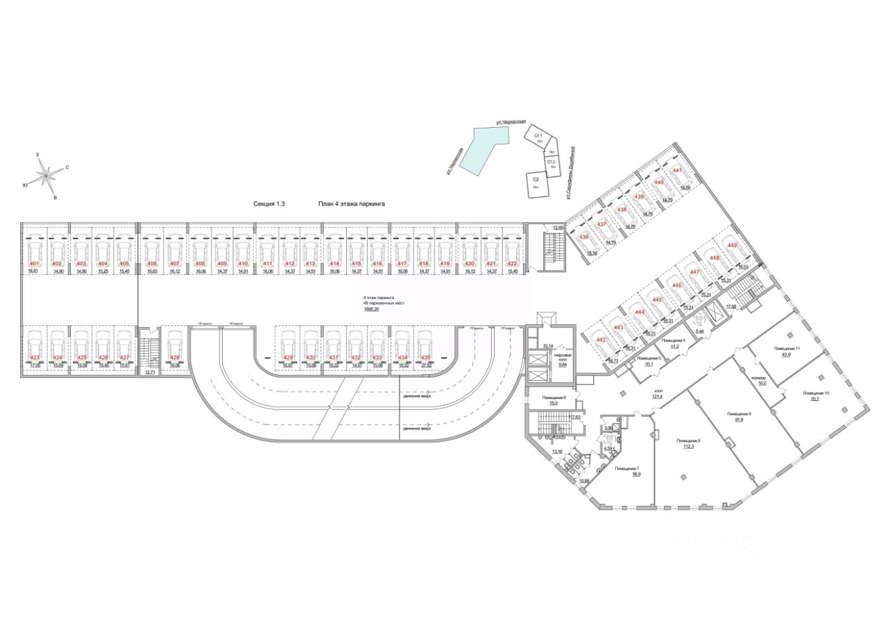 Коммерческие и офисные площади размещаются в секции 1.1 и на 3-х этажах делового центра (секция 1.3).