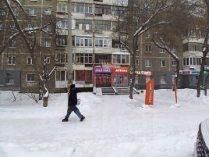 - расположено на первой линии на ул. Советской, рядом с перекрестком с ул. Уральской;