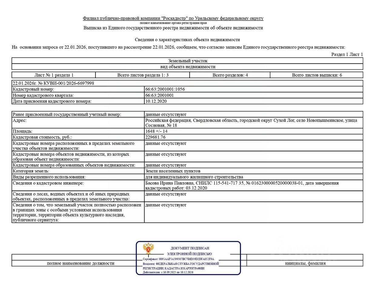 Лот 1 продажа земельного участка с кадастровым номером 66:63:2001001:1056, расположенного по адресу: Российская федерация, Свердловская область, городской округ Сухой Лог, село Новопышминское, улица Сосновая, 18 (категория земель земли населенных пунктов), с разрешенным использованием для индивидуального жилищного строительства, общей площадью 1648,0 кв.м, территориальная зона Ж3 ЗОНА ЗАСТРОЙКИ ИНДИВИДУАЛЬНЫМИ ЖИЛЫМИ ДОМАМИ В СЕЛЬСКИХ НАСЕЛЕННЫХ ПУНКТАХ (далее земельный участок) в границах, указанных в выписке из Единого государственного реестра недвижимости об объекте недвижимости.