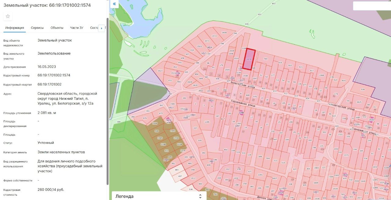 Лот 1. Земельный участок для ведения личного подсобного хозяйства. Категория земель земли населенных пунктов. Кадастровый номер 66:19:1701002:1574. Местоположение: Свердловская область, городской округ город Нижний Тагил, поселок Уралец, улица Белогорская, з/у 12а. Площадь земельного участка 2081 кв. метр. Разрешенное использование земельного участка для ведения личного подсобного хозяйства (приусадебный земельный участок). Начальная цена (рыночная стоимость земельного участка) 650 000 (шестьсот пятьдесят тысяч) рублей. "Шаг аукциона" 32 400 (тридцать две тысячи четыреста) рублей. Размер задатка 130 000 (сто тридцать тысяч) рублей