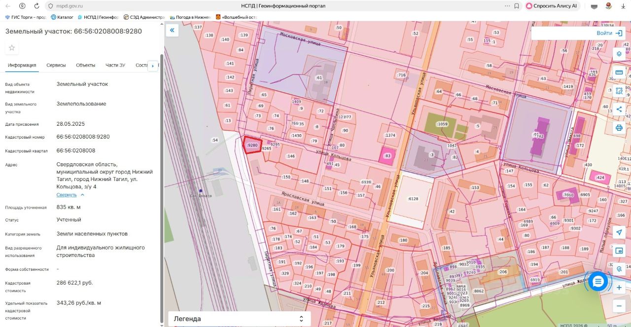 Лот 2. Земельный участок для индивидуального жилищного строительства. Категория земель земли населенных пунктов. Кадастровый номер 66:56:0208008:9280. Местоположение: Свердловская область, муниципальный округ город Нижний Тагил, город Нижний Тагил, улица Кольцова, з/у 4. Площадь земельного участка 835 кв. метров. Разрешенное использование земельного участка для индивидуального жилищного строительства. Начальная цена (кадастровая стоимость земельного участка) 286 622 (двести восемьдесят шесть тысяч шестьсот двадцать два) рубля 10 копеек. "Шаг аукциона" 14 300 (четырнадцать тысяч триста) рублей. Размер задатка 57 300 (пятьдесят семь тысяч триста) рублей