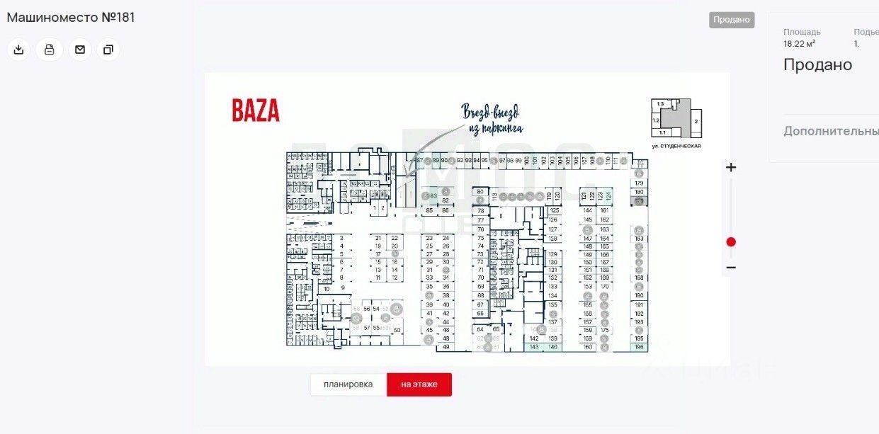 Продажа паркинга / машиноместа в ЖК Теплые кварталы, -1 этаж, спуск на лифте, вторая очередь, номер машиноместа 181, площадь 18,22 кв.м,