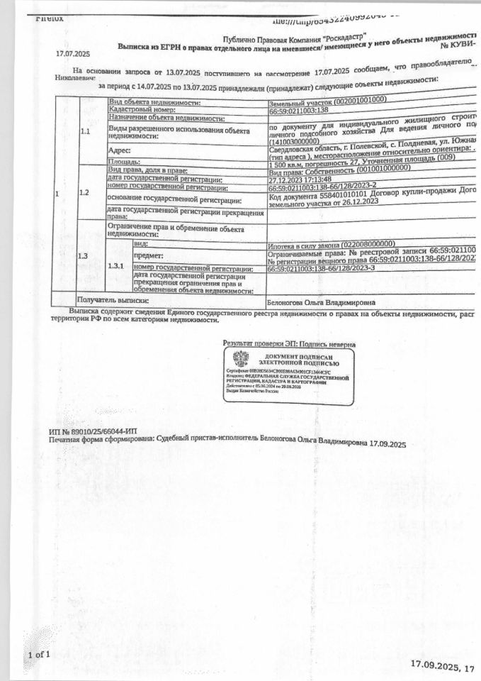 Должник: Панченко Н.Н., собственник: Панченко Н.Н. Лот: Земельный участок (земли населенных пунктов, для индивидуального жилищного строительства и ведения личного подсобного хозяйства), площадь 1500 кв.м., кадастровый номер: 66:59:0211003:138, г. Полевской, с. Полдневая, ул. Южная, д. 1, н/ц: 287100 р., з-к: 287 р., код: 0014, рег. 44-3380/25
