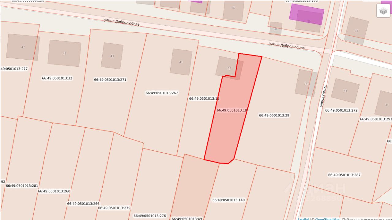 Земельный участок с кадастровым номером 66:49:0501013:19, общей площадью 946,0 кв.м., местоположение: Свердловская область, город Кировград, улица Добролюбова, в 7 метрах восточнее дома 39