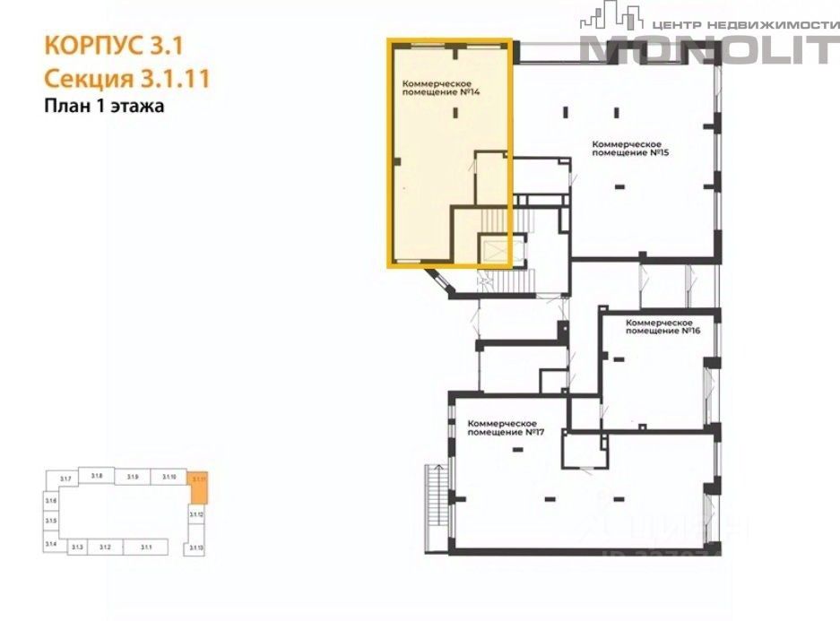 1 очередь строительства помещение расположено в доме 3.1., выходит на ул. Амундсена.