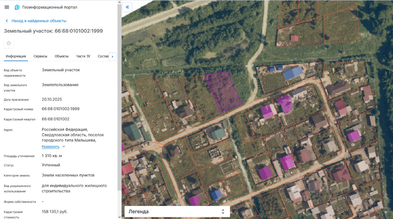 Земельный участок с кадастровым номером 66:68:0101002:1999, площадью 1310,0 кв.м., разрешенное использование: для индивидуального жилищного строительства, категория земель земли населенных пунктов, местоположение: Свердловская область, пгт. Малышева, мкр. Зеленый, д. 38.
