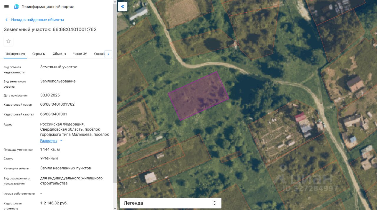 Земельный участок с кадастровым номером 66:68:0401001:762, площадью 1144,0 кв.м., разрешенное использование: для индивидуального жилищного строительства, категория земель земли населенных пунктов