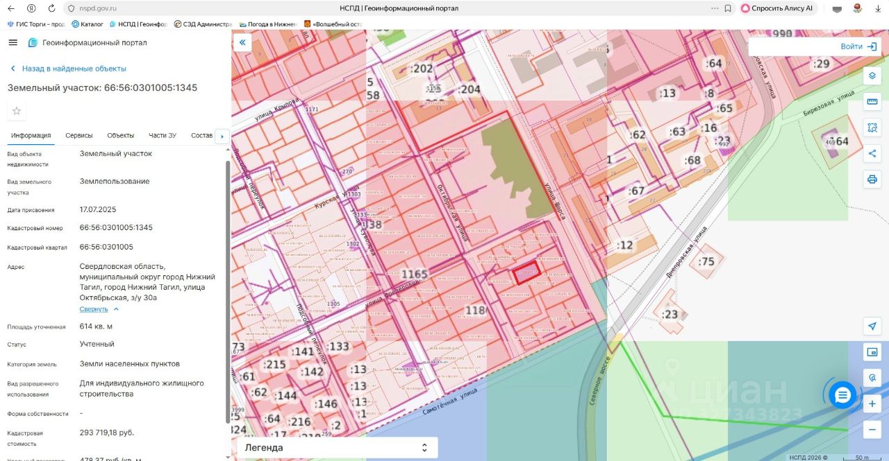 Лот 5. Земельный участок для индивидуального жилищного строительства. Категория земель земли населенных пунктов. Кадастровый номер 66:56:0301005:1345. Местоположение: Свердловская область, муниципальный округ город Нижний Тагил, город Нижний Тагил, улица Октябрьская, з/у 30а. Площадь земельного участка 614 кв. метров. Разрешенное использование земельного участка для индивидуального жилищного строительства. Начальная цена (кадастровая стоимость земельного участка) 293 719 (двести девяносто три тысячи семьсот девятнадцать) рублей 18 копеек. "Шаг аукциона" 14 600 (четырнадцать тысяч шестьсот) рублей. Размер задатка 58 700 (пятьдесят восемь тысяч семьсот) рублей