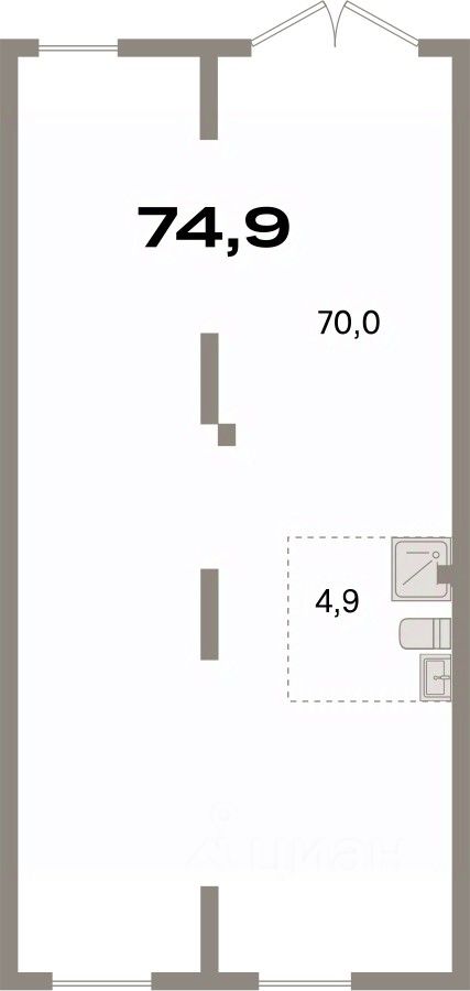 Помещение свободного назначения на 1 этаже, общая площадь 74.9 кв.м., без отделки. Стоимость помещения 15,720,000 руб., цена за кв.м 209,879 руб.