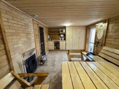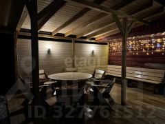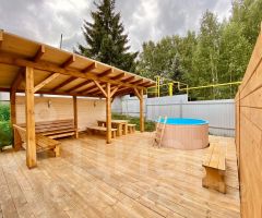 Участок площадью 10 соток включает две полностью автономные бани, каждая из которых оборудована санузлом, душевой, комнатой отдыха с гардеробом и мини-кухней. Отделка выполнена качественными материалами, мебель изготовлена на заказ с учетом эргономики, обеспечивая комфорт для гостей. К каждой бане примыкает просторная терраса с беседкой, мангальной зоной и бассейном.