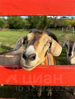 На территории ферма с милыми животными (кошки, козы, барашки, гуси, кролики)