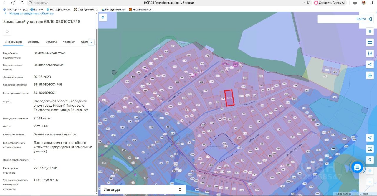 Лот 2. Земельный участок для ведения личного подсобного хозяйства. Категория земель земли населенных пунктов. Кадастровый номер 66:19:0801001:746. Местоположение: Свердловская область, городской округ город Нижний Тагил, село Елизаветинское, улица Ленина, з/у 48а. Площадь земельного участка 2541 кв. метр. Разрешенное использование земельного участка для ведения личного подсобного хозяйства (приусадебный земельный участок). Начальная цена (кадастровая стоимость земельного участка) 279 992 (двести семьдесят девять тысяч девятьсот девяносто два) рубля 79 копеек. "Шаг аукциона" 13 900 (тринадцать тысяч девятьсот) рублей. Размер задатка 56 000 (пятьдесят шесть тысяч) рублей