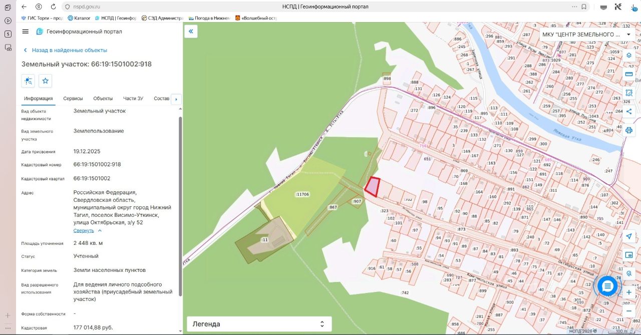 Лот 2. Земельный участок для ведения личного подсобного хозяйства. Категория земель земли населенных пунктов. Кадастровый номер 66:19:1501002:918. Местоположение: Российская Федерация, Свердловская область, муниципальный округ город Нижний Тагил, поселок Висимо-Уткинск, улица Октябрьская, з/у 52. Площадь земельного участка 2448 кв. метров. Разрешенное использование земельного участка для ведения личного подсобного хозяйства (приусадебный земельный участок). Начальная цена (кадастровая стоимость земельного участка) 177 014 (сто семьдесят семь тысяч четырнадцать) рублей 88 копеек. "Шаг аукциона" 8 800 (восемь тысяч восемьсот) рублей. Размер задатка 35 400 (тридцать пять тысяч четыреста) рублей