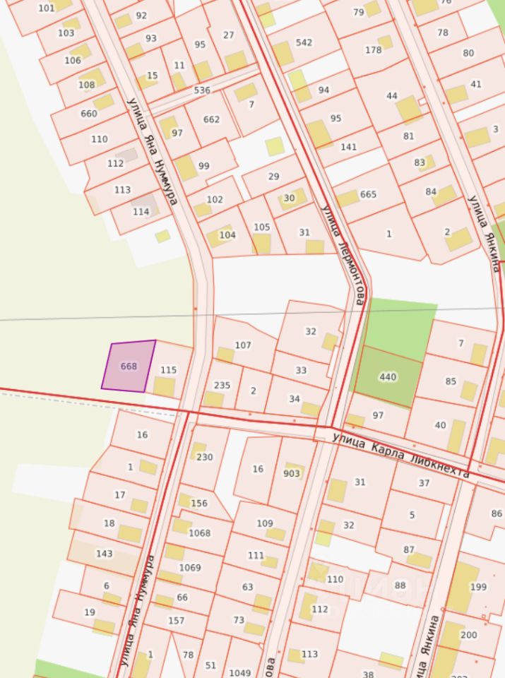 Земельный участок с кадастровым номером 66:51:0106001:668 площадь 1103 по адресу Российская Федерация, Свердловская область, муниципальный округ Красноуральск, город Красноуральск, ул. Карла Либкнехта, 30
