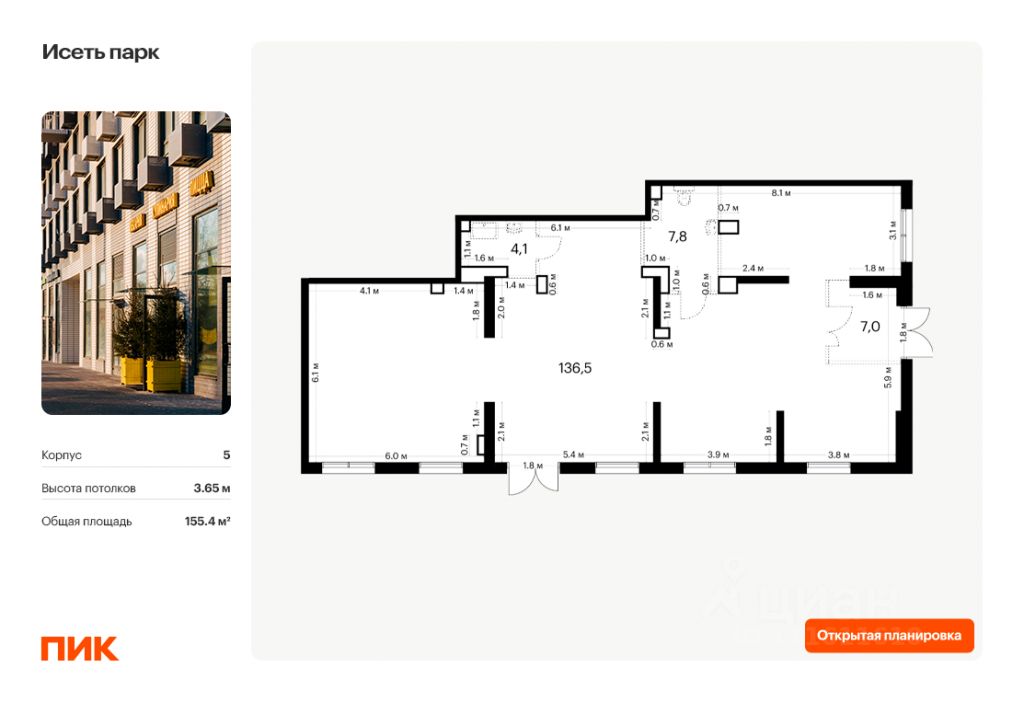 - Открытая планировка, возможно объединить несколько помещений