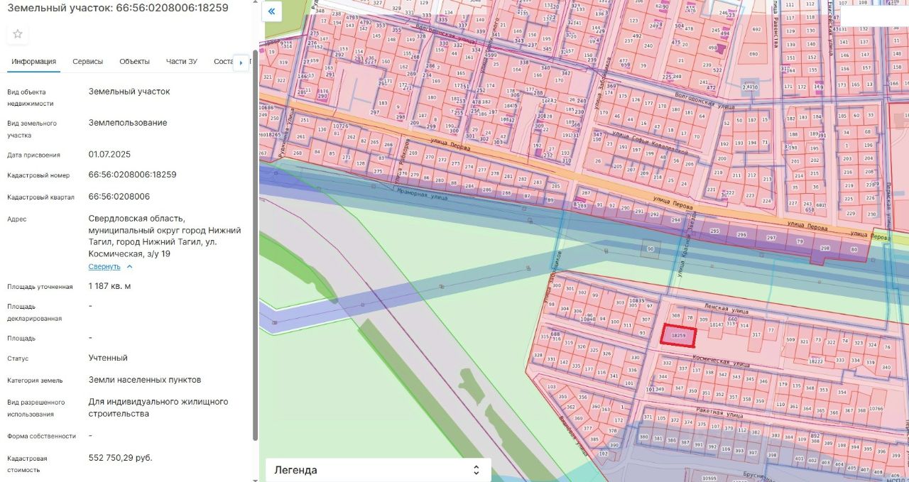Лот 2. Земельный участок для индивидуального жилищного строительства. Категория земель земли населенных пунктов. Кадастровый номер 66:56:0208006:18259. Местоположение: Свердловская область, муниципальный округ город Нижний Тагил, город Нижний Тагил, улица Космическая, з/у 19. Площадь земельного участка 1187 кв. метров. Разрешенное использование земельного участка для индивидуального жилищного строительства. Начальная цена (кадастровая стоимость земельного участка) 552 750 (пятьсот пятьдесят две тысячи семьсот пятьдесят) рублей 29 копеек. "Шаг аукциона" 27 600 (двадцать семь тысяч шестьсот) рублей. Размер задатка 110 500 (сто десять тысяч пятьсот) рублей