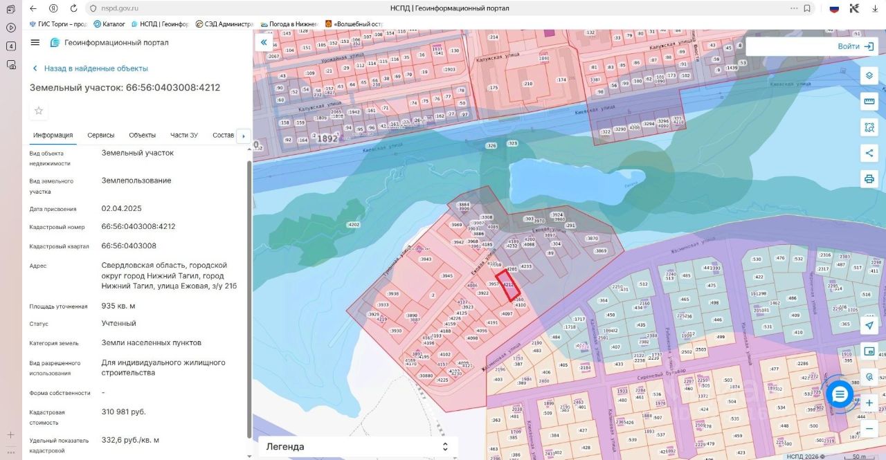 Лот 3. Земельный участок для индивидуального жилищного строительства. Категория земель земли населенных пунктов. Кадастровый номер 66:56:0403008:4212. Местоположение: Свердловская область, городской округ город Нижний Тагил, город Нижний Тагил, улица Ежовая, з/у 21б. Площадь земельного участка 935 кв. метров. Разрешенное использование земельного участка для индивидуального жилищного строительства. Начальная цена (кадастровая стоимость земельного участка) 310 981 (триста десять тысяч девятьсот восемьдесят один) рубль. "Шаг аукциона" 15 500 (пятнадцать тысяч пятьсот) рублей. Размер задатка 62 200 (шестьдесят две тысячи двести) рублей