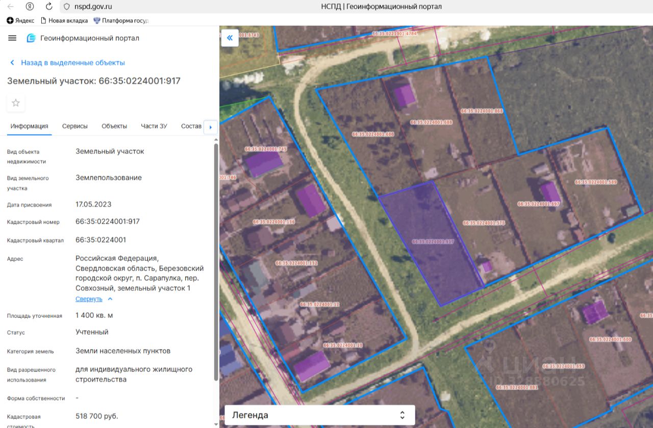 Продажа земельного участка, площадью 1400,0 кв.м, по адресу: Российская Федерация, Свердловская область, Березовский городской округ, п. Сарапулка, пер. Совхозный, земельный участок 1, вид разрешенного использования для индивидуального жилищного строительства, категория земель земли населенных пунктов, кадастровый номер 66:35:0224001:917.