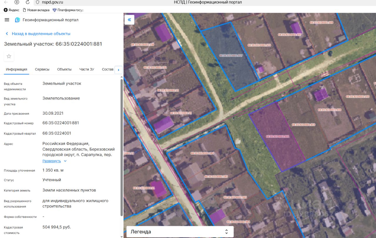 Продажа земельного участка, площадью 1350,0 кв.м, по адресу: Российская Федерация, Свердловская область, Березовский городской округ, п.Сарапулка, пер.Совхозный, земельный участок 2, вид разрешенного использования для индивидуального жилищного строительства, категория земель земли населенных пунктов, кадастровый номер 66:35:0224001:881.