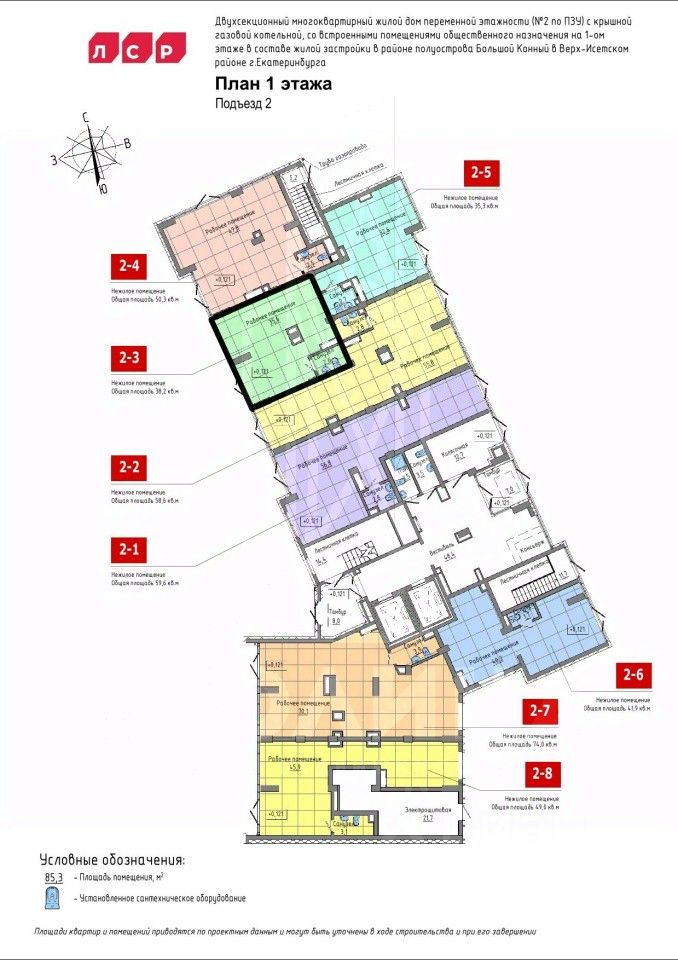 В сданном доме в ЖК "Зеленый остров" предлагаем к продаже коммерческое помещение 38,3 кв.м., помещение (2-3 на плане) с отдельным входом, изолированным от территории двора.