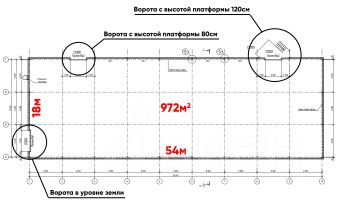 - 3 ворот для разного вида транспорта, под фуру (высота ворот от земли 120см), под малотоннажный транспорт (высота ворот от земли 80см)и в уровене земли.