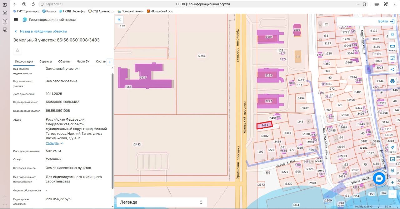 Лот 2. Земельный участок для индивидуального жилищного строительства. Категория земель земли населенных пунктов. Кадастровый номер 66:56:0601008:3483. Местоположение: Российская Федерация, Свердловская область, муниципальный округ город Нижний Тагил, город Нижний Тагил, улица Васильковая, з/у 43г. Площадь земельного участка 502 кв. метра. Разрешенное использование земельного участка для индивидуального жилищного строительства. Начальная цена (кадастровая стоимость земельного участка) 220 056 (двести двадцать тысяч пятьдесят шесть) рублей 72 копейки. "Шаг аукциона" 11 000 (одиннадцать тысяч) рублей. Размер задатка 44 000 (сорок четыре тысячи) рублей