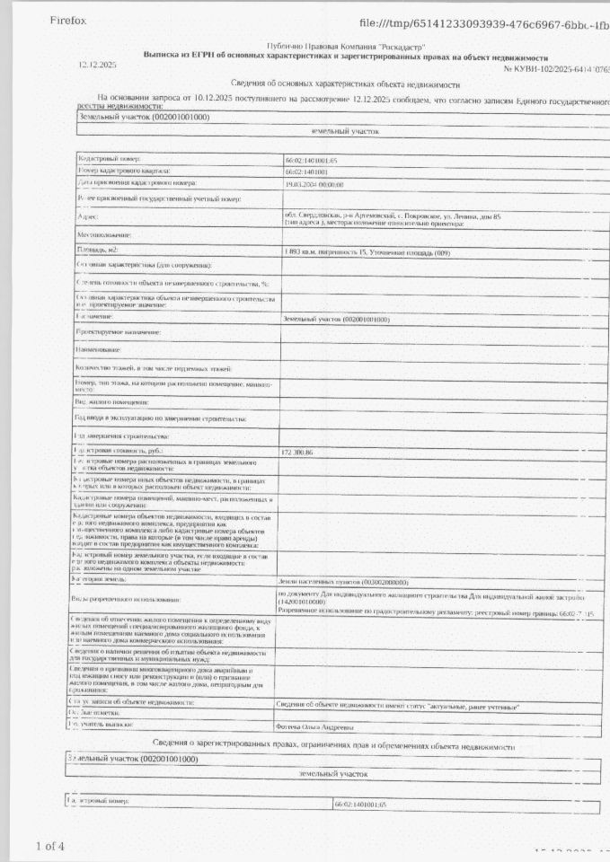 Должник: Марупова П.Т., собственник: Марупова П.Т. Лот: Земельный участок (земли населенных пунктов, для индивидуального жилищного строительства), площадь 1893 кв.м., кадастровый номер: 66:02:1401001:65, Артемовский р-н, с. Покровское, ул. Ленина, д. 85, н/ц: 235200 р., з-к: 235 р., код: 0014, рег. 14-399/26