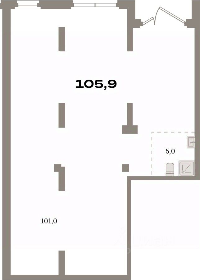 Помещение свободного назначения на 1 этаже, общая площадь 105.9 кв.м., без отделки. Стоимость помещения 23,490,000 руб., цена за кв.м 221,813 руб.