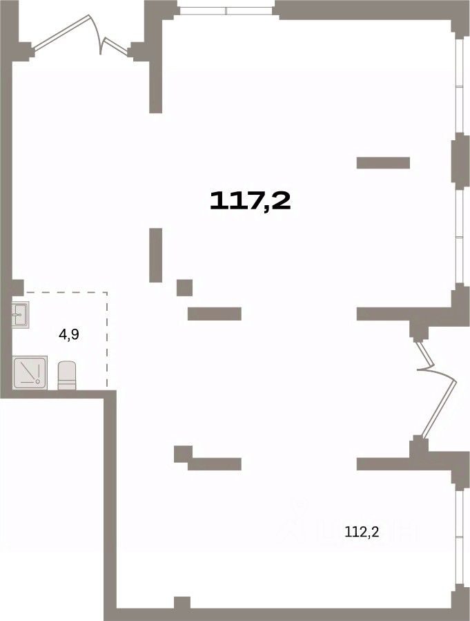 Помещение свободного назначения на 1 этаже, общая площадь 117.2 кв.м., без отделки. Стоимость помещения 27,980,000 руб., цена за кв.м 238,737 руб.