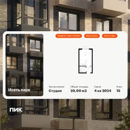 Продаётся квартира-студия площадью 20 кв.м на 15 этаже 24 этажного дома (Корпус 4, Секция 1) проекта ПИК Исеть парк. Светлый просторный подъезд на уровне земли, функциональная планировка, большие окна, предчистовая отделка.