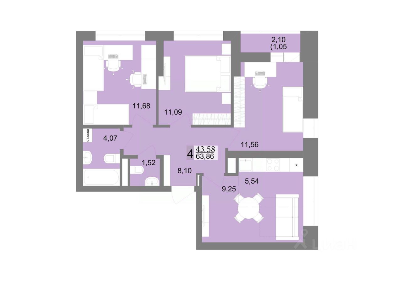 Общая площадь64,09 м²