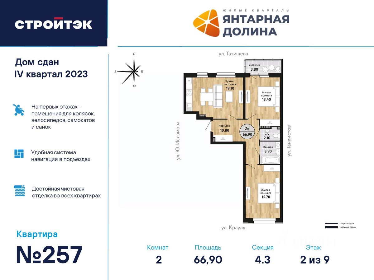 Жилой квартал "Янтарная долина" расположен в районе Новый Виз, вблизи Верх-Исетского пруда. Предлагаем вам 374 квартиры в пятой очереди строительства — секциях 4.1-4.4. Это дом переменной этажности от 9 до 21 этажа по адресу улица Крауля, 170а. Дом сдан. Продажа от застройщика по договору купли-продажи. Район В Новом Визе городской комфорт сочетается с зелёной природой. Это одно из самых перспективных направлений в Екатеринбурге. 5 минут пешком до остановки транспорта 5 школ и 4 детсада поблизости 10 минут хода до набережной Верх-Исетского пруда 15 минут на машине до центра города 16 минут на машине до "МЕГИ" Двор В центре жилого квартала — двор для насыщенной жизни, игр и отдыха. Концепция "Двор без машин", когда можно заехать только для разгрузки и погрузки Детские площадки для разного возраста, футбол и уличный баскетбол Закрытая территория с пропускной системой и без посторонних Круглосуточное видеонаблюдение и освещение территории Подъезды Подъезд в "Янтарной долине" — яркое и светлое пространство, от которого становится приятно. Доступ в подъезды на уровне земли — без барьеров Домофоны в тёплых остеклённых тамбурах Вместительные грузопассажирские лифты во всех секциях Помещения для колясок и самокатов на 1 этаже Удобная навигация с номерами этажей и квартир Планировки Наш подход к проектированию квартир называется "Разумные метры". Это значит не только исходить из площади, но и учитывать число жильцов и их потребности. Объединённые кухни-гостиные для простора и общения В зависимости от вашего стиля жизни — по несколько вариантов планировок, от студий до 3-комнатных Отказ от бесполезных "мёртвых" зон 52 вида уникальных планировок Отделка В каждой квартире "Янтарной долины" мы позаботились о чистовой отделке, чтобы ваш переезд прошёл быстро и не вызвал лишних хлопот. Прочный водостойкий ламинат на полу в комнатах, прихожих и кухнях, плитка в санузлах, на стенах виниловые обои на флизелиновой основе, белые натяжные потолки Межкомнатные двери светлых тонов и сейф-дверь на входе в квартиру В санузлах установлены раковины и унитазы, а во всей квартире — розетки и выключатели Радиаторы с терморегуляторами и горизонтальной разводкой, двухкамерные стеклопакеты с приточными клапанами вентиляции Телеметрические счётчики на свет, тепло и воду