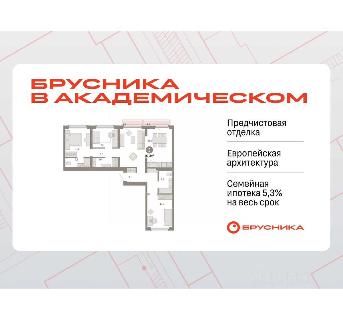 Квартира с кухней-гостиной и тремя спальнями в Бруснике в Академическом. Особенности планировки: второй санузел, вид во двор, разнесённые спальни, предчистовая отделка, мастер-спальня, постирочная, балкон.