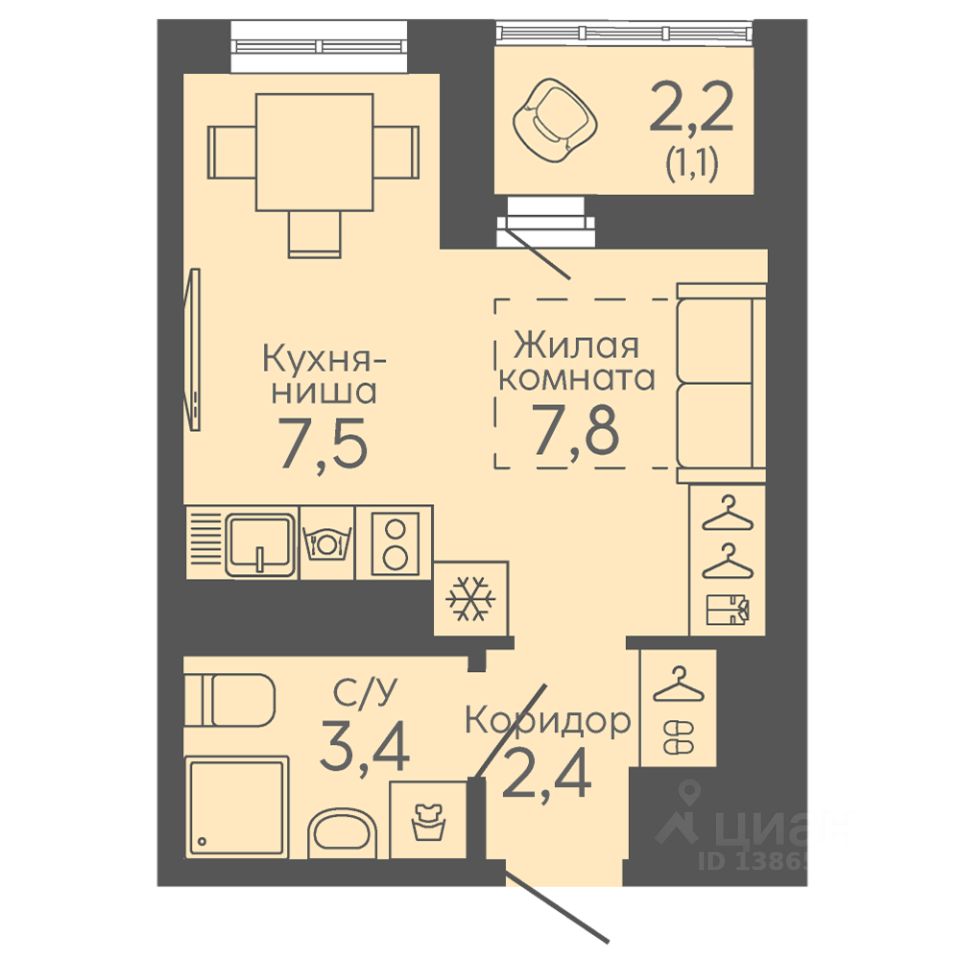 Общая площадь22,2 м²