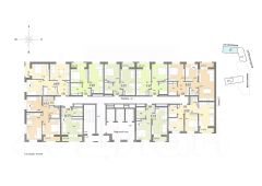 На первом этаже есть детская комната и коворкинг. Пока малыши играют, родители могут заняться текущими рабочими вопросами или просто отдохнуть. Также есть зона с пуфиками и телевизором. В каждой секции предусмотрены колясочные, чтобы жители могли комфортно распоряжаться пространством.