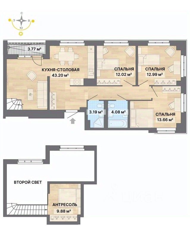 Закрытый зелёный двор-сад. Подземный паркинг с доступом на лифте. Готовые квартиры с чистовой отделкой, в том числе варианты с мебелью, доступные в "Арендотеку".