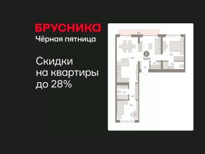 Квартира с кухней-гостиной и двумя спальнями в Бруснике в Академическом. Особенности планировки: второй санузел, вид во двор, разнесённые спальни, предчистовая отделка, мастер-спальня, постирочная, балкон.