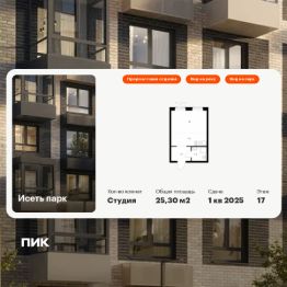 Продаётся квартира-студия площадью 25,3 кв.м на 17 этаже 24 этажного дома (Корпус 6, Секция 1) проекта ПИК Исеть парк. Светлый просторный подъезд на уровне земли, функциональная планировка, большие окна, предчистовая отделка.