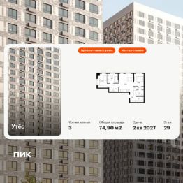 Продаётся 3-комн. квартира площадью 74,9 кв.м на 29 этаже 29 этажного дома (Корпус 6, Секция 1) проекта ПИК Утёс. Светлый просторный подъезд на уровне земли, функциональная планировка, большие окна, предчистовая отделка.