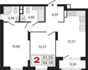 Продаётся квартира в Квартал-парк "Каменные палатки". 2-комнатная квартира, 64,35 м², 317, Очередь 4, секция 16. Стоимость указана с учетом чистовой отделки.