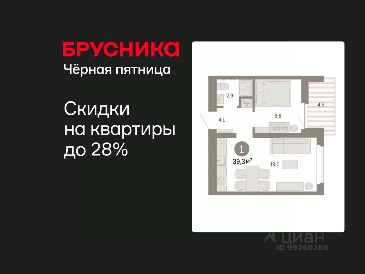 Квартира с кухней-гостиной и одной спальней в Бруснике в Академическом. Особенности планировки: предчистовая отделка, балкон.
