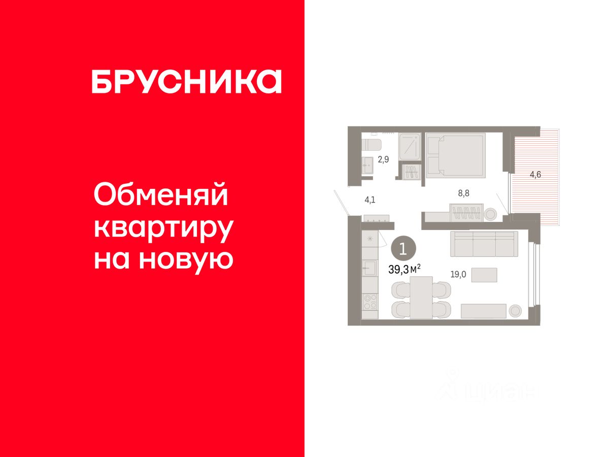 Квартира с кухней-гостиной и одной спальней в Бруснике в Академическом. Особенности планировки: балкон, предчистовая отделка.