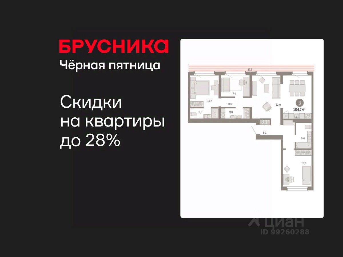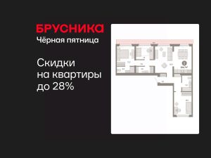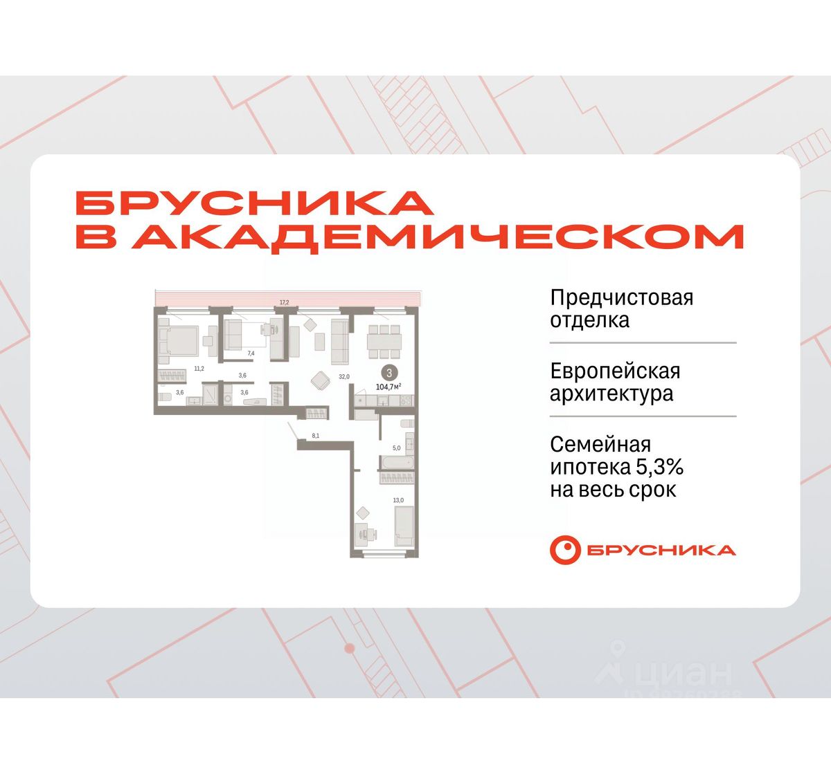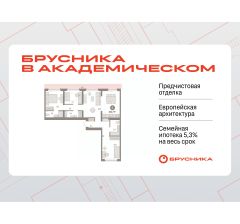 Квартира с кухней-гостиной и тремя спальнями в Бруснике в Академическом. Особенности планировки: второй санузел, вид во двор, разнесённые спальни, предчистовая отделка, мастер-спальня, постирочная, терраса на крыше.
