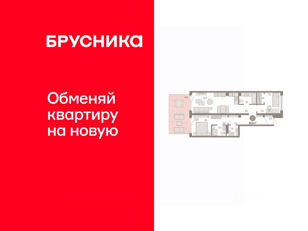 Квартира с кухней-гостиной и двумя спальнями в Бруснике в Академическом. Особенности планировки: отдельный вход, предчистовая отделка, разнесённые спальни.