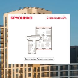 Квартира с кухней-гостиной и двумя спальнями в Бруснике в Академическом. Особенности планировки: вид во двор, второй санузел, гардеробная, мастер-спальня, предчистовая отделка, разнесённые спальни, терраса на крыше.