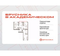 Квартира с кухней-гостиной и двумя спальнями в Бруснике в Академическом. Особенности планировки: второй санузел, рабочий кабинет, вид во двор, разнесённые спальни, предчистовая отделка, мастер-спальня, постирочная, балкон.