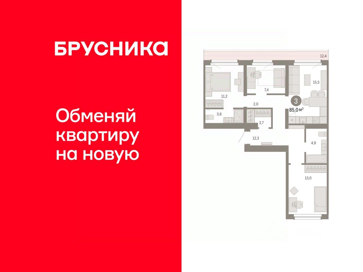 Квартира с кухней-гостиной и двумя спальнями в Бруснике в Академическом. Особенности планировки: предчистовая отделка, рабочий кабинет, разнесённые спальни, терраса на крыше.